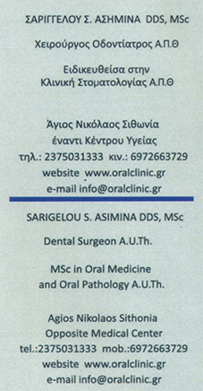 Υπηρεσίες ΣτοματολογίαςΤραυματισμοίΑντιδραστικές υπερπλασίεςΑυτοάνοσα νοσήματα, ΝεοπλάσματαΜυκητιασικές ΛοιμώξειςΔέχεται καθημερινά 09:00 -13:00 & 17:30 -21:00 κατόπιν ραντεβού.